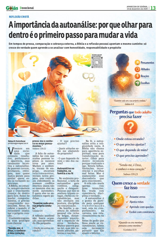 Em tempos de pressa, comparação e cobrança externa, a Bíblia e a reflexão pessoal apontam o mesmo caminho: só cresce de verdade quem aprende a se analisar com honestidade, responsabilidade e propósito