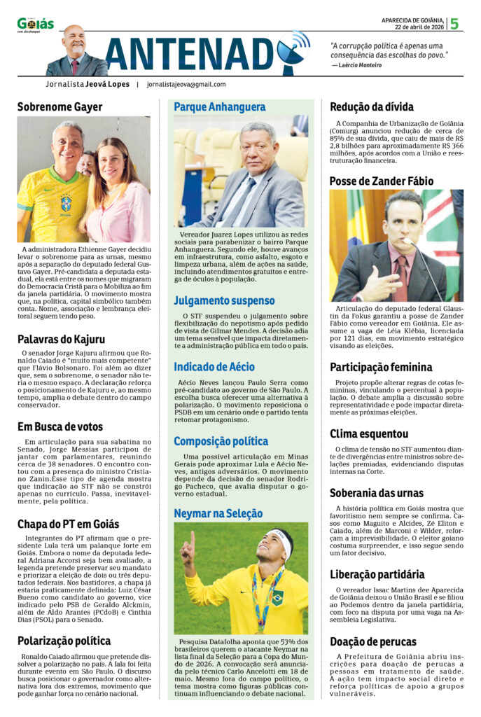 A nova edição da coluna Antenado, assinada pelo jornalista Jeová Lopes, traz uma leitura direta dos bastidores que movimentam Goiás e o cenário nacional. A página reúne articulações partidárias, reposicionamentos estratégicos, disputa por espaço político e temas que já influenciam o tabuleiro de 2026.
