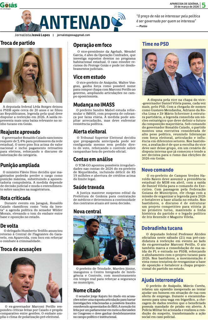 A política goiana segue em ritmo acelerado, com movimentações estratégicas, trocas partidárias, embates públicos e articulações de bastidores que já desenham o cenário eleitoral de 2026. A Coluna Antenado desta edição de hoje reúne os principais fatos que movimentaram o Estado nos últimos dias.