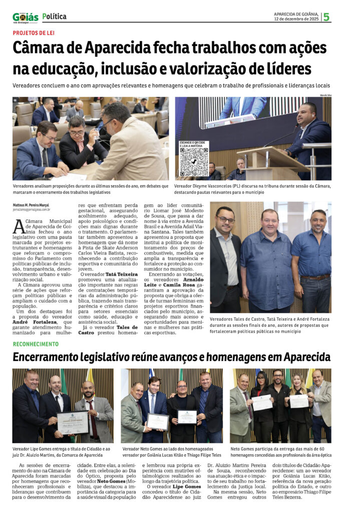 A Câmara Municipal de Aparecida de Goiânia fechou o ano legislativo com uma pauta marcada por projetos estruturantes e homenagens que reforçam o compromisso do Parlamento com políticas públicas de inclusão, transparência, desenvolvimento urbano e valorização social.