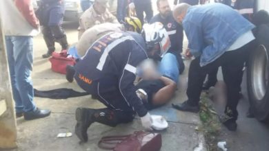 Mulher é atropelada por ônibus após se desequilibrar e cair, em Aparecida