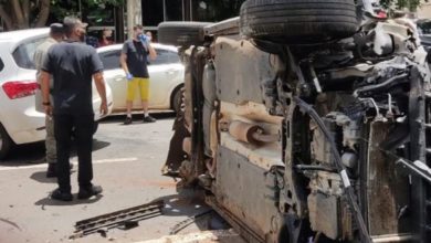 Carro da Secretaria de Saúde capota na avenida República do Líbano, em Goiânia