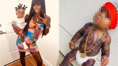 Mulher causa polêmica ao postar fotos do filho coberto de tatuagens
