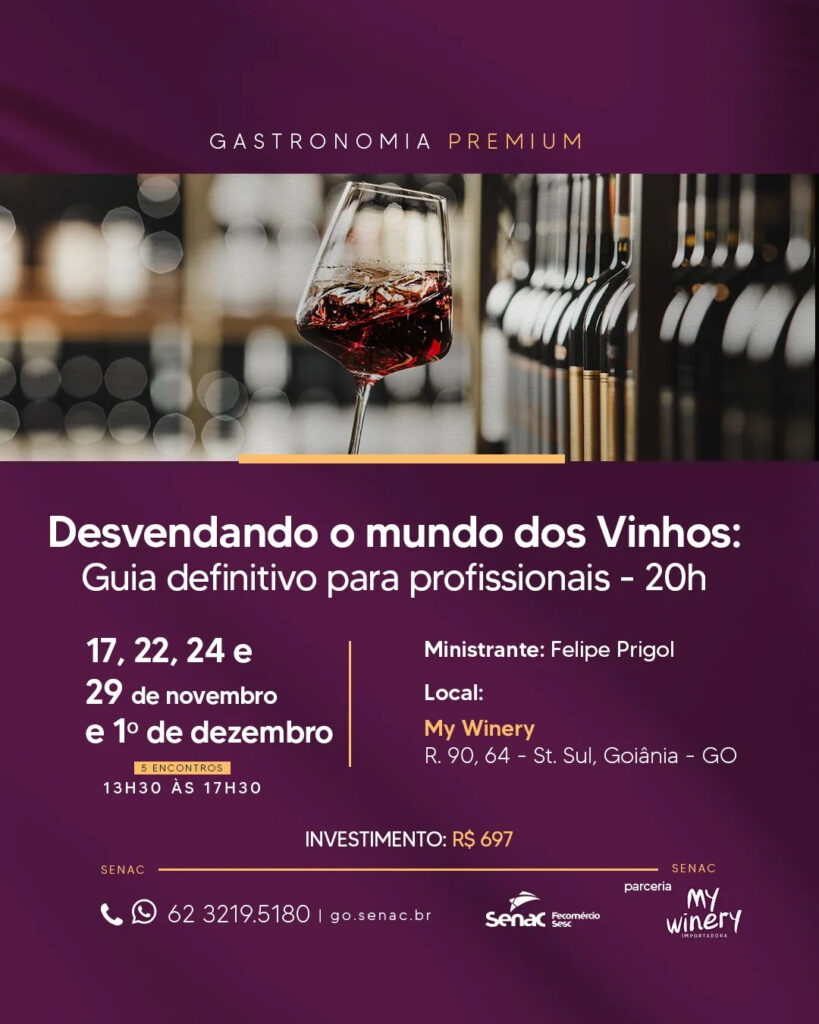 A programação foi organizada para facilitar a participação de quem precisa conciliar trabalho e estudo. As aulas acontecem na sede da My Winery, no Setor Sul, e incluem degustações orientadas pelo sommelier Felipe Prigol, profissional com atuação internacional e certificações reconhecidas. A formação aborda temas como variedades de uvas, regiões produtoras, técnicas de serviço e tendências de consumo, permitindo que os alunos desenvolvam uma percepção mais sensível sobre cada taça.