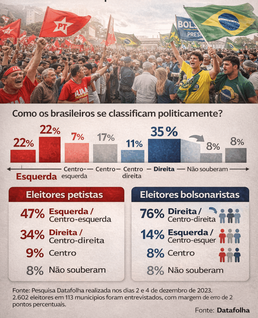 Uma pesquisa recente do Datafolha revelou um retrato complexo e até contraditório da forma como os brasileiros se identificam politicamente. O levantamento mostra que uma parcela significativa dos eleitores que se declaram petistas afirma ter posições ideológicas associadas à direita, enquanto parte dos bolsonaristas se vê como pertencente à esquerda ou ao centro-esquerda.