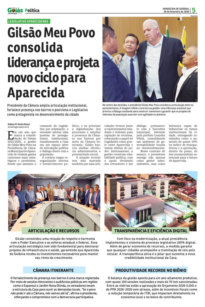 Em um ano que marca a consolidação do biênio 2025-2026, a gestão de Gilsão Meu Povo na Presidência da Câmara Municipal de Aparecida de Goiânia ganha contornos mais estratégicos e produtivos. Desde que assumiu o comando do Legislativo por aclamação, o vereador adotou uma postura de protagonismo institucional, transformando a Casa em um espaço ativo de articulação política e diálogo direto com a população.