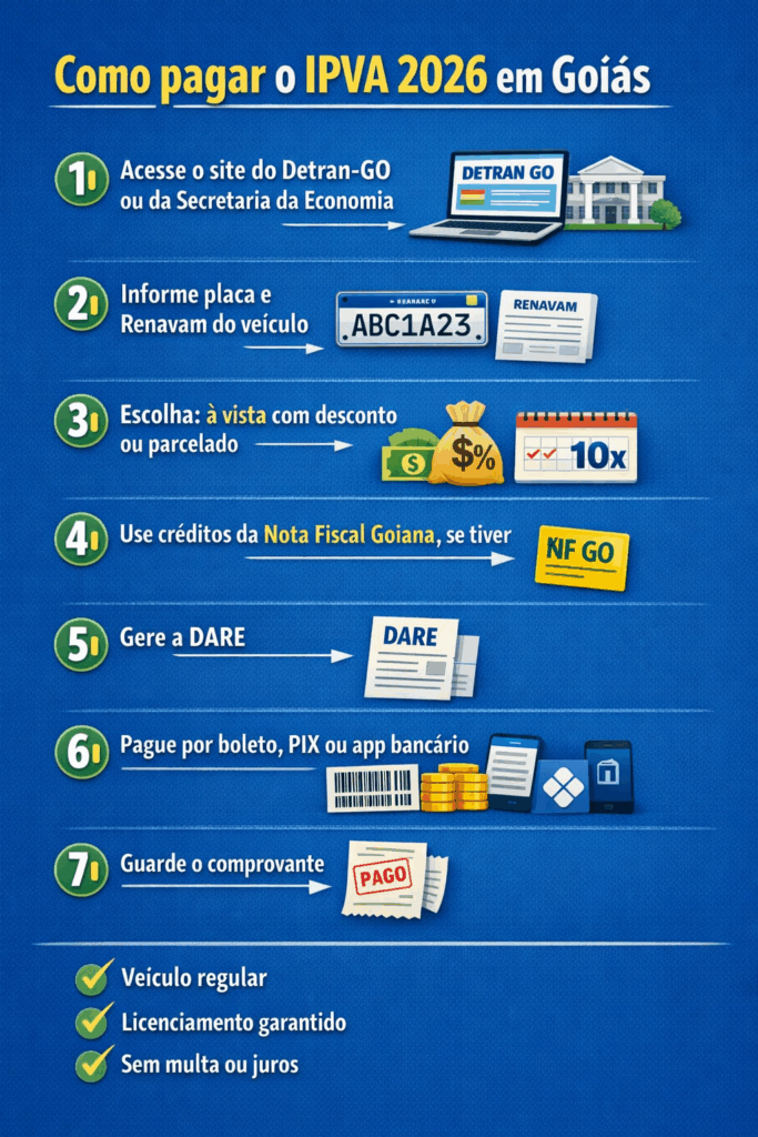 O pagamento pode ser feito de forma simples e digital. O contribuinte deve acessar o site da Secretaria da Economia ou do Detran-GO, informar a placa e o Renavam do veículo e emitir a DARE.