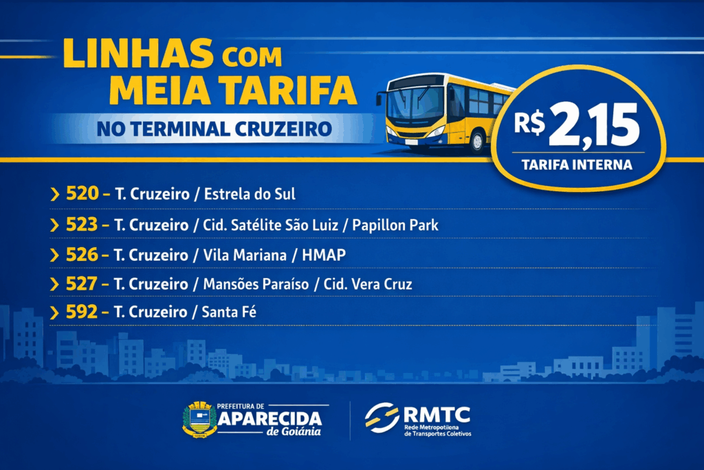 Com a ampliação do benefício da Meia Tarifa, usuários do transporte coletivo passaram a contar, desde o último sábado, com a possibilidade de embarcar no Terminal Cruzeiro pagando R$ 2,15 para deslocamentos realizados exclusivamente dentro de Aparecida de Goiânia. A medida consolida a política tarifária no município e completa a cobertura do benefício em todos os terminais locais.