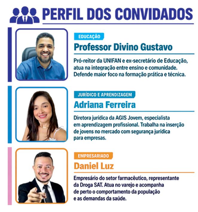 Apresentado por Maione Padeiro e gravado nos estúdios da emissora, o programa reuniu o professor Divino Gustavo, pró-reitor da UNIFAN, a advogada Adriana Ferreira, diretora jurídica da AGIS Jovem, e o empresário Daniel Luz, do setor farmacêutico. O encontro colocou frente a frente quem forma, quem orienta juridicamente e quem contrata.