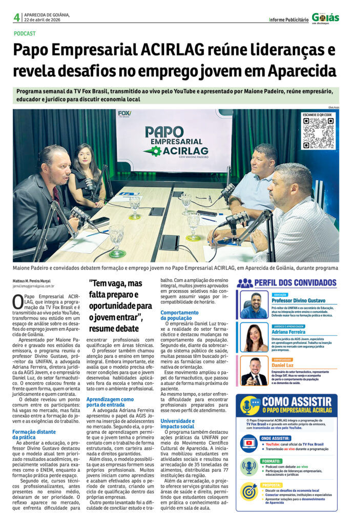 O Papo Empresarial ACIRLAG, que integra a programação da TV Fox Brasil e é transmitido ao vivo pelo YouTube, transformou seu estúdio em um espaço de análise sobre os desafios do emprego jovem em Aparecida de Goiânia.