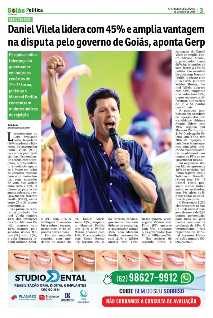 Quando o cenário inclui maior fragmentação entre candidaturas de esquerda, o governador amplia ainda mais a vantagem. Vilela atinge 45%, enquanto Marconi Perillo permanece com 21% e Wilder Morais com 15%. Outros nomes, como Luiz César Bueno, aparecem com apenas 5%.