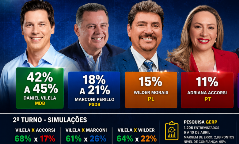 O governador Daniel Vilela lidera a disputa pelo governo de Goiás em todos os cenários analisados pelo instituto Gerp, segundo levantamento divulgado nesta terça-feira. A pesquisa mostra o emedebista com intenções de voto que variam entre 42% e 45%, abrindo vantagem consistente sobre os adversários.