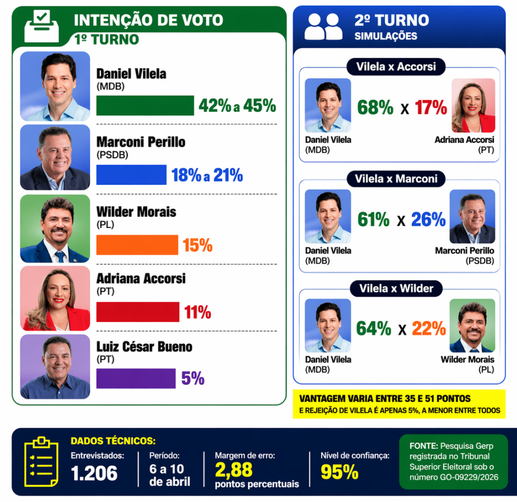 No cenário principal de primeiro turno, Vilela aparece com 42%, seguido por Marconi Perillo, com 18%. Wilder Morais registra 15%, Adriana Accorsi tem 11% e os demais candidatos não ultrapassam um dígito. A diferença entre o primeiro e o segundo colocado chega a 24 pontos percentuais.