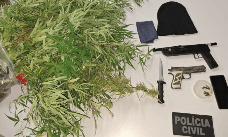 Durante o cumprimento das ordens judiciais, a busca domiciliar revelou o material que reforça o conjunto probatório: a arma artesanal supostamente utilizada nos roubos, munições, uma faca e diversas mudas de maconha. O flagrante resultou também na prisão por tráfico de drogas e posse irregular de arma e munição. Um dos celulares subtraídos nos assaltos foi localizado no imóvel.