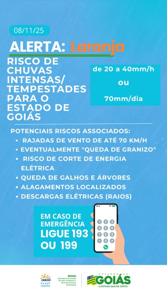 O tempo muda drasticamente em Goiás neste fim de semana. O Centro de Informações Meteorológicas e Hidrológicas de Goiás (Cimehgo) emitiu um alerta laranja de risco para tempestades severas, com ventos fortes, descargas elétricas, chuvas volumosas e possibilidade de queda de granizo. O aviso é válido principalmente para este sábado (8), com destaque para as regiões Norte, Sul e Entorno do Distrito Federal, onde a combinação de calor intenso, alta umidade e avanço de instabilidades atmosféricas aumenta o potencial para eventos extremos.7