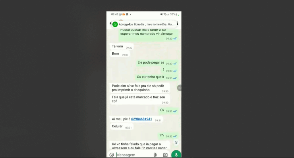 No dia seguinte, a paciente foi surpreendida por mensagens enviadas pela mesma funcionária, via WhatsApp, informando que o exame havia sido viabilizado — porém, mediante o pagamento de um valor via PIX equivalente à metade do preço cobrado em um laboratório particular.