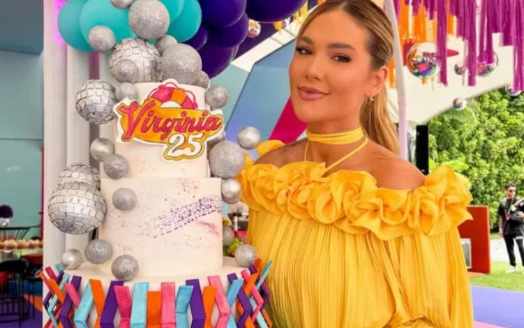 Em sua festa, Virginia escolheu um look amarelo para marcar a ocasião especial e posou ao lado do impressionante bolo de três andares, além de compartilhar detalhes da decoração vibrante do evento.