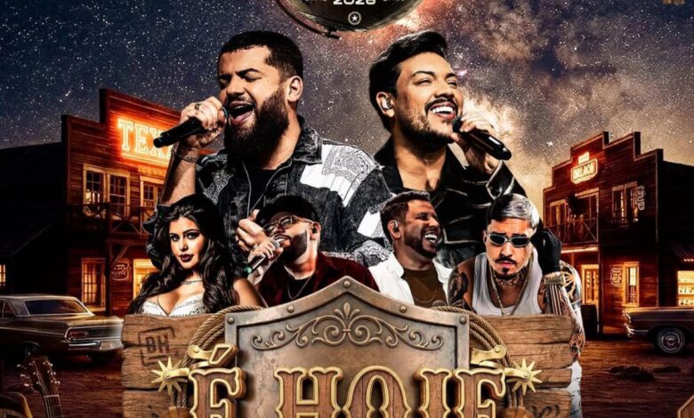 A principal atração da noite é a dupla Ícaro & Gilmar, que comanda o palco em um evento que reúne música sertaneja, ambientação temática, áreas reservadas e open bar premium, em clima de festival.